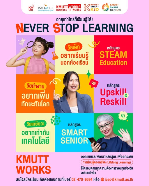 (N)ever (S)top Learning อายุเท่าไหร่ก็เรียนรู้ได้ ที่ KMUTTWORKS เพราะเรา คือ ศูนย์การศึกษาต่อเนื่องที่ออกแบบและพัฒนาหลักสูตร เพื่อยกระดับการเรียนรู้ให้ครอบคลุมทุกช่วงวัย (Lifelong Learning)