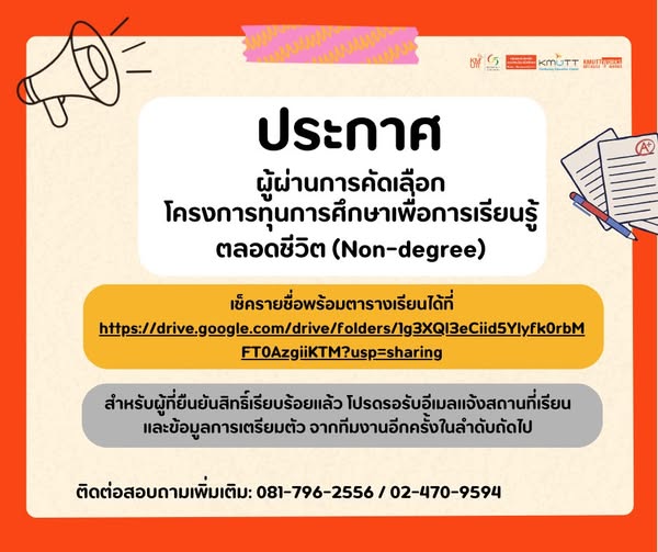 ประกาศรายชื่อผู้มีสิทธิ์เข้าร่วมโครงการทุนการศึกษาเพื่อการเรียนรู้ตลอดชีวิต (Non-degree)