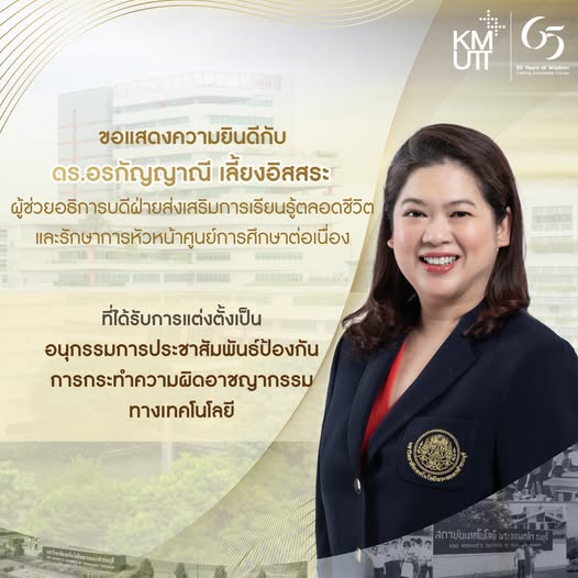 ขอแสดงความยินดีกับ ดร.อรกัญญาณี เลี้ยงอิสสระ ผู้ช่วยอธิการบดีฝ่ายส่งเสริมการเรียนรู้ตลอดชีวิต และ รักษาการหัวหน้าศูนย์การศึกษาต่อเนื่อง มหาวิทยาลัยเทคโนโลยีพระจอมเกล้าธนบุรี
